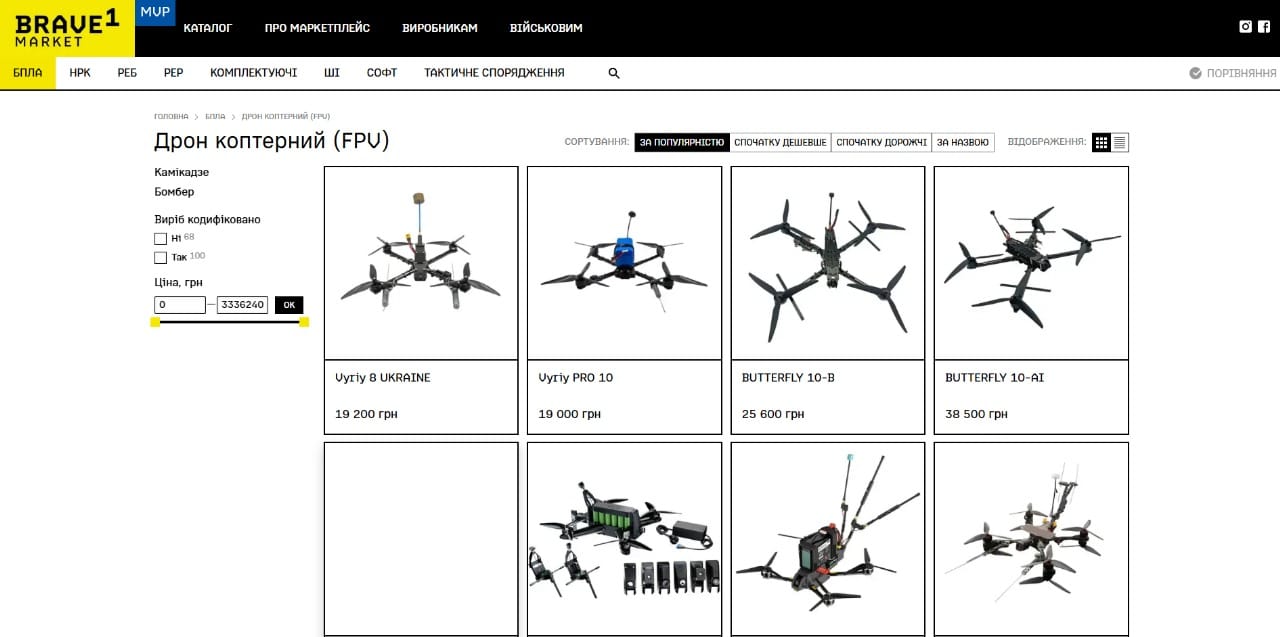The purpose is to provide the military with flexible, rapid access to new products, Yuliia Myrna, who is in charge of the Brave1 Market, told Counteroffensive.Pro. It allows military units to independently select, purchase, and receive the items they need to deal with the operational situation on the front line. At the moment, the platform features over 3,600 products, such as FPV drones, ground drones, electronic warfare systems and components.