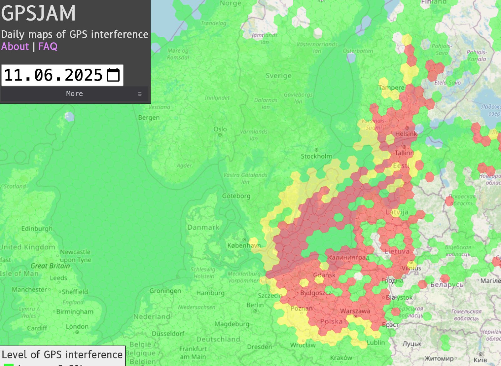 Map of GPS jamming over Poland and the Baltic. Screenshot taken from the GPSJAM website.
