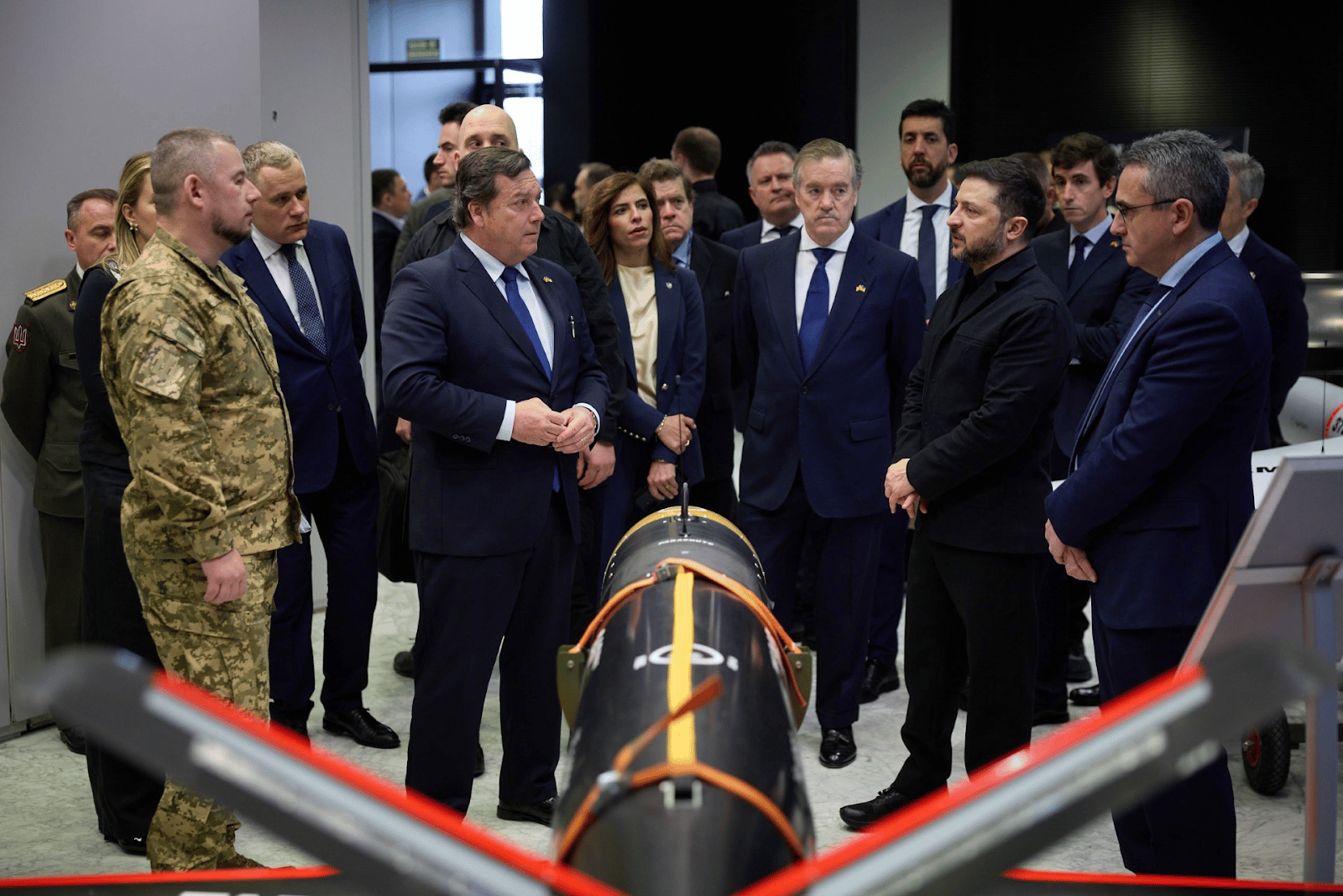 Sener representatives speak with President Zelenskyy near the Scrab III aerial target drone. Photo provided by Sener.