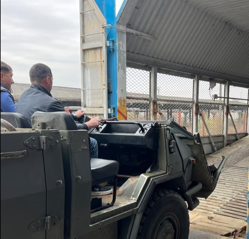A military vehicle being loaded into a railway car. Photo taken from volunteer Iryna Fedyshyna's Facebook page.